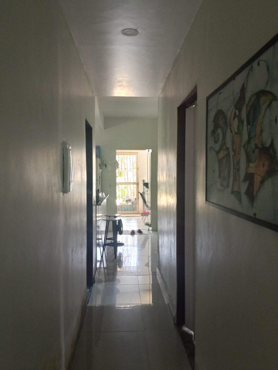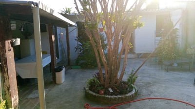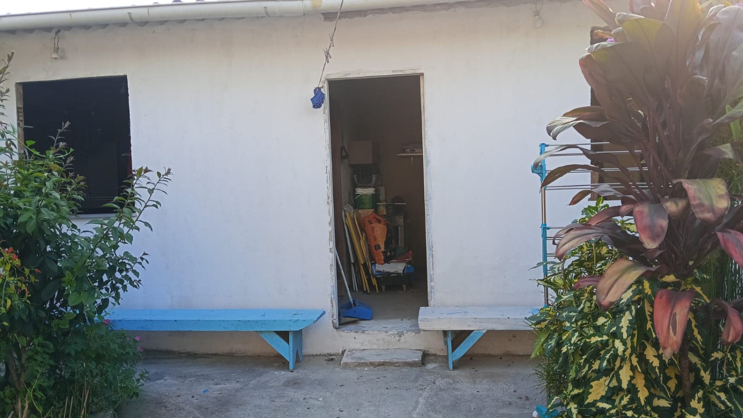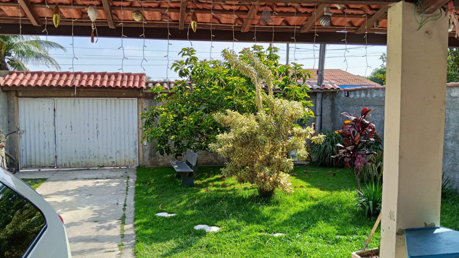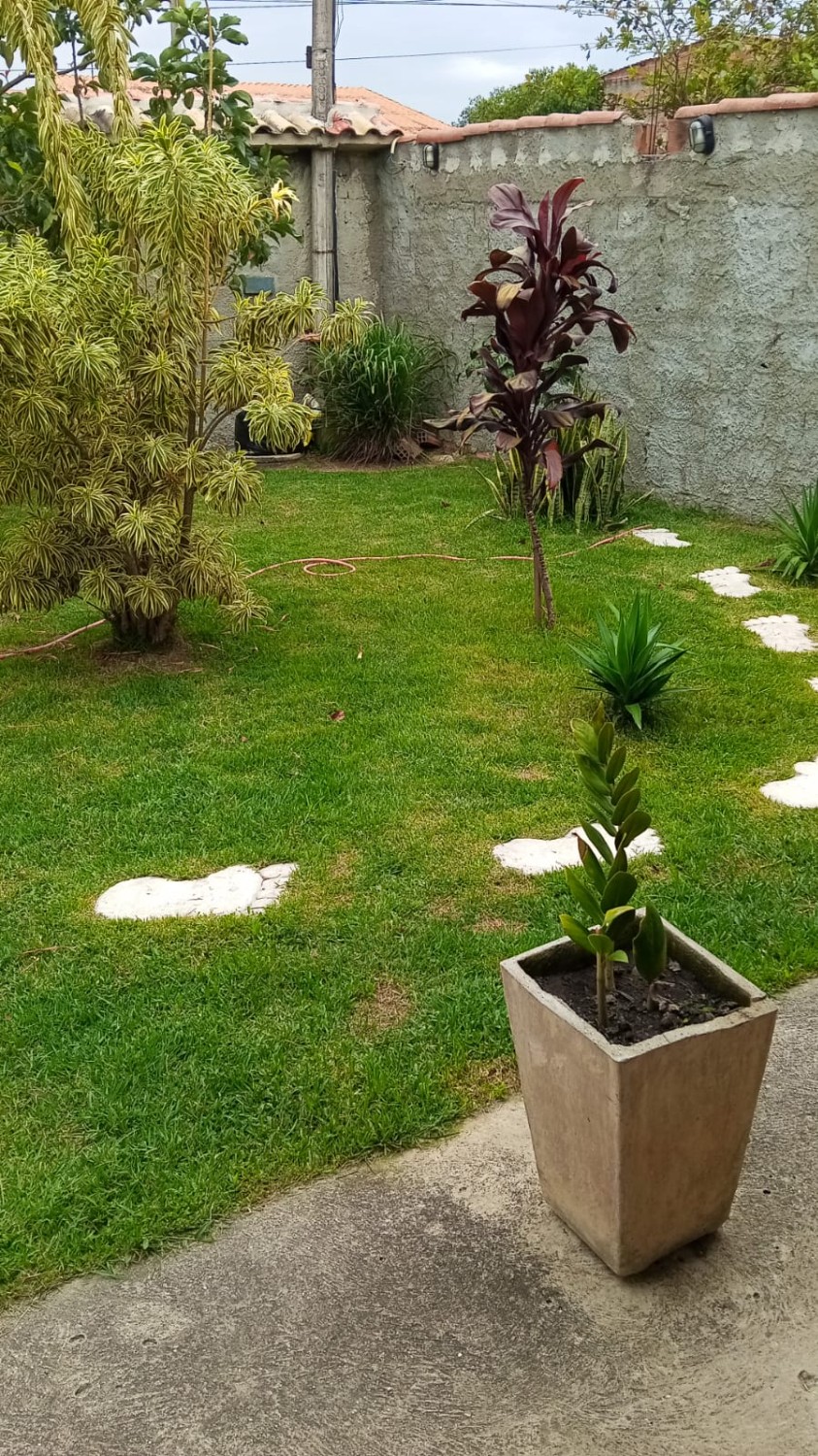 Quintal na frente com jardim, quintal nos fundos e corredor lateral