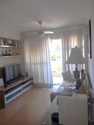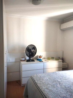 Varandão, sala ampla em dois ambientes com rebaixamento do teto em gesso, rack, ventilador de teto, cozinha com armários, área de serviço com aquecedor e tanque, banheiro social com box blindex, espelho e armário embaixo da pia. Dois quartos sendo uma suíte e ambos com armários planejados e ar condicionado.