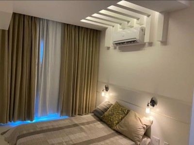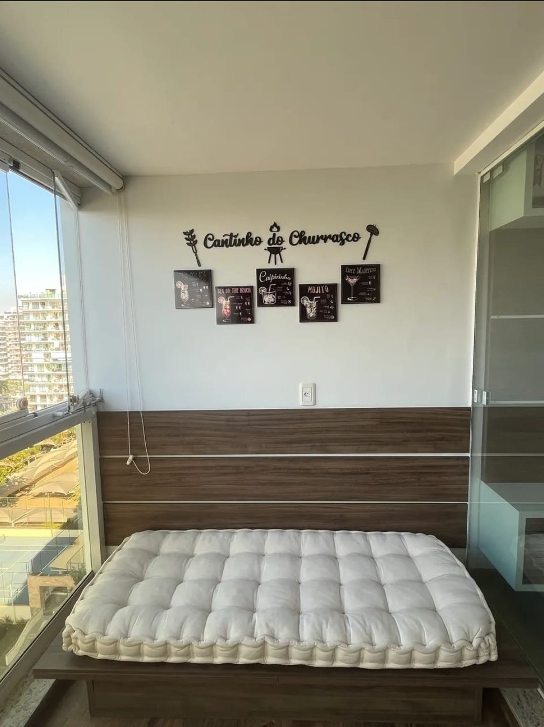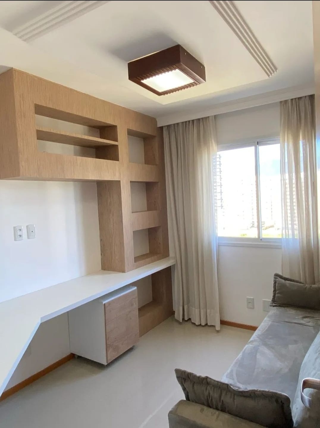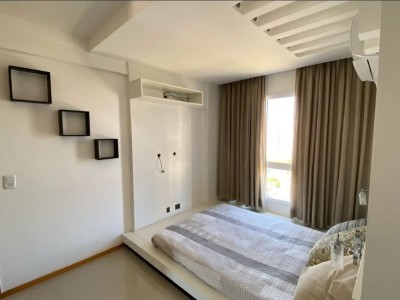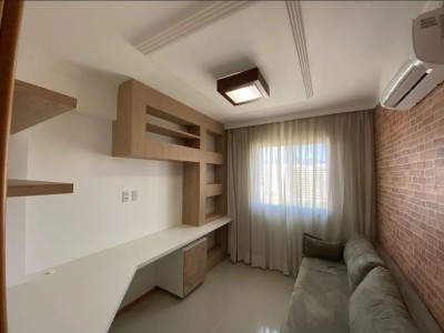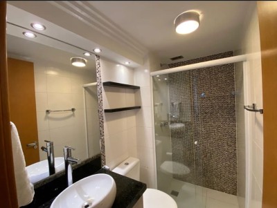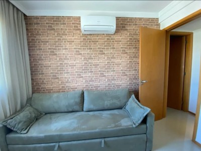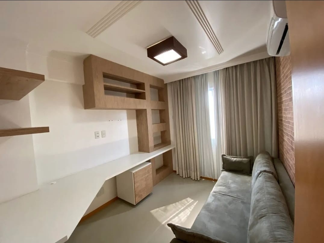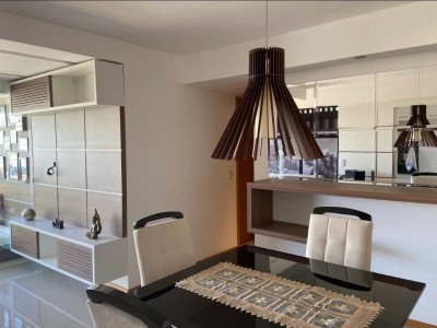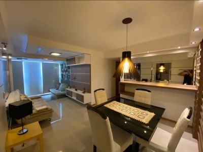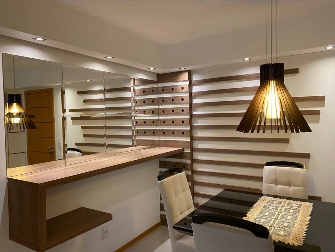 Descrição › Apartamento todo mobiliado e decorado por arquiteto, sala espaçosa e aconchegante em 2 Ambientes com teto rebaixado em gesso e projeto de iluminação, porcelanato, parede espelhada, varanda gourmet com fechamento em cortina de vidro, 2 Quartos, sendo 1 Suíte igualmente Mobiliados e Decorados.