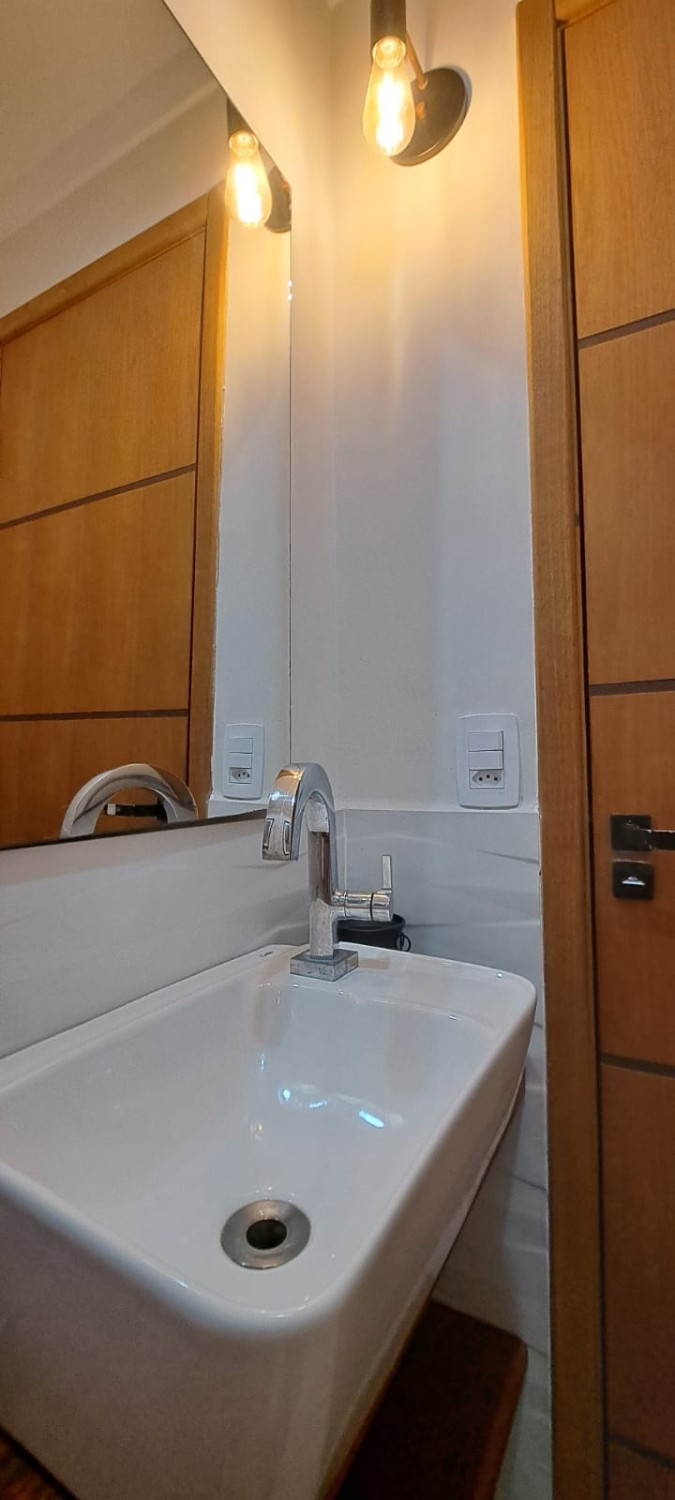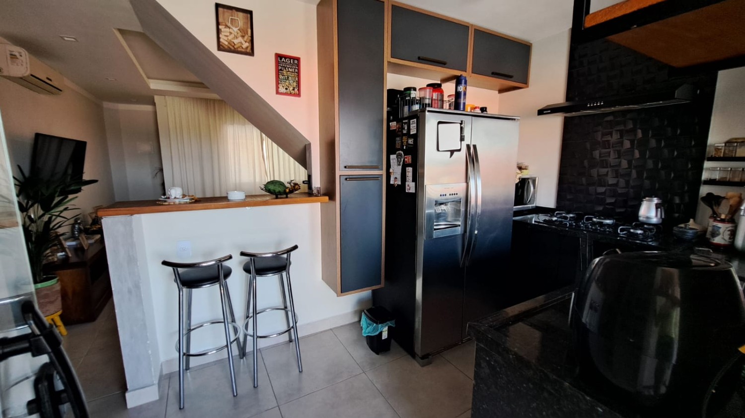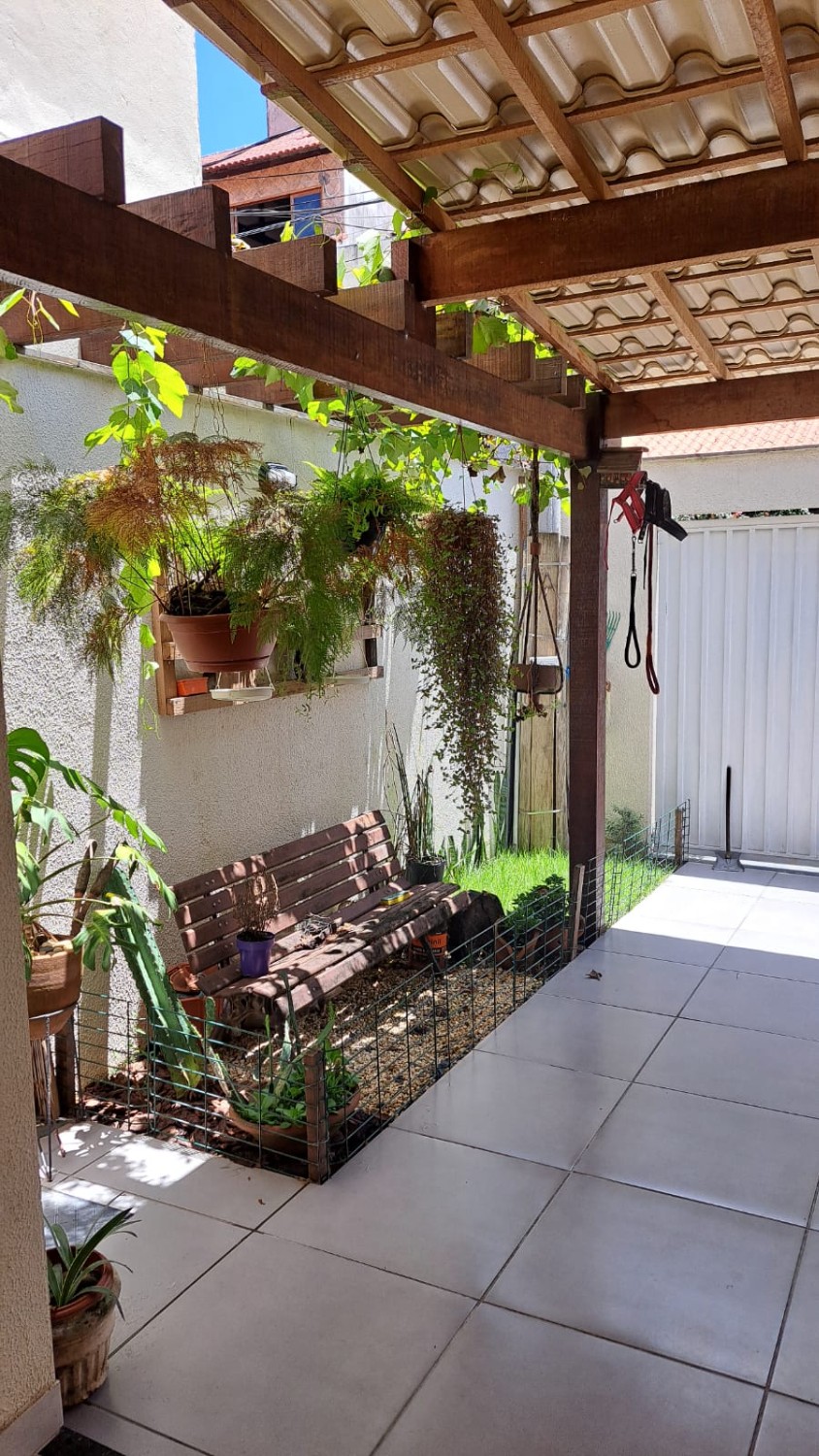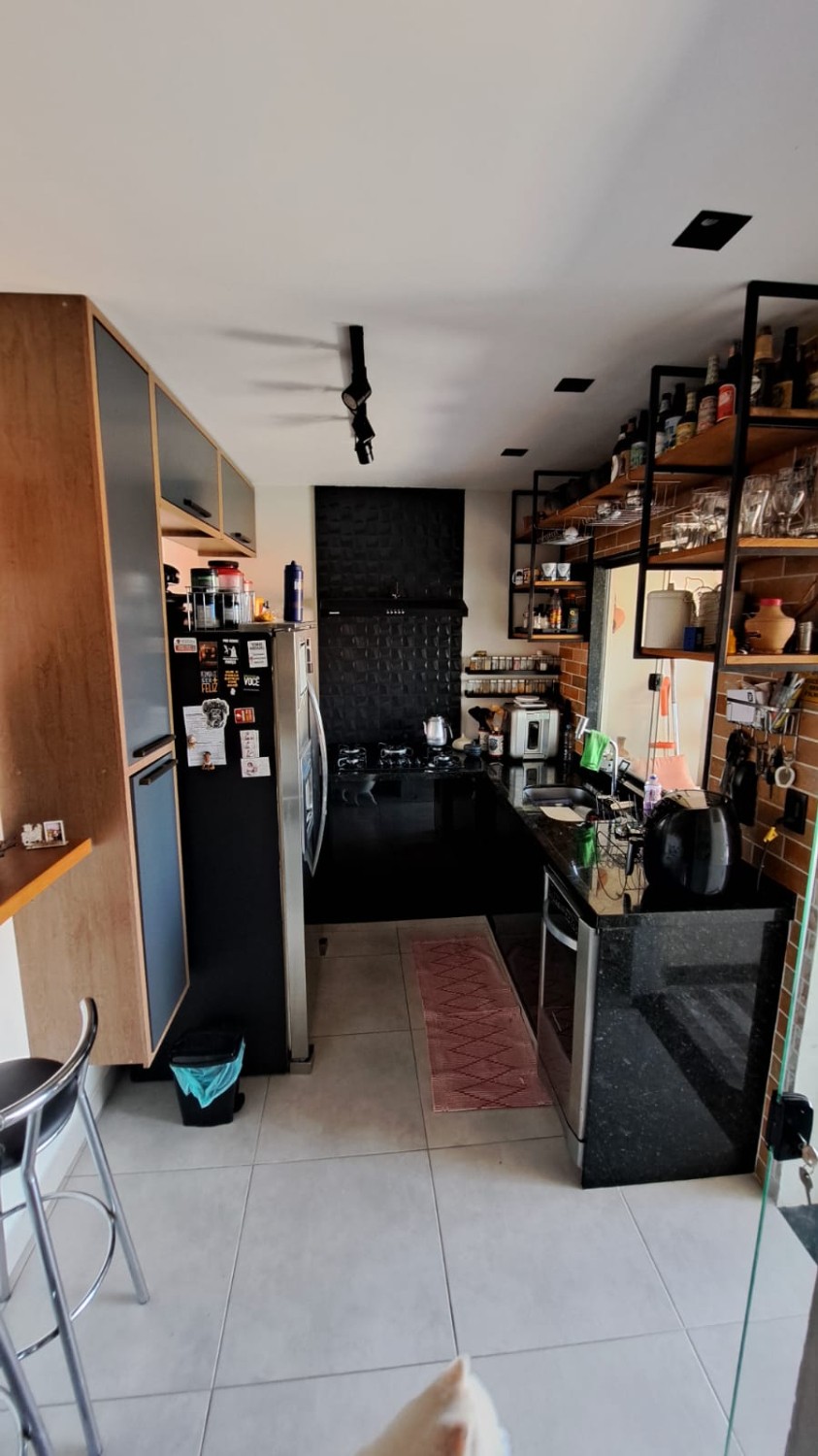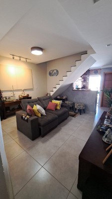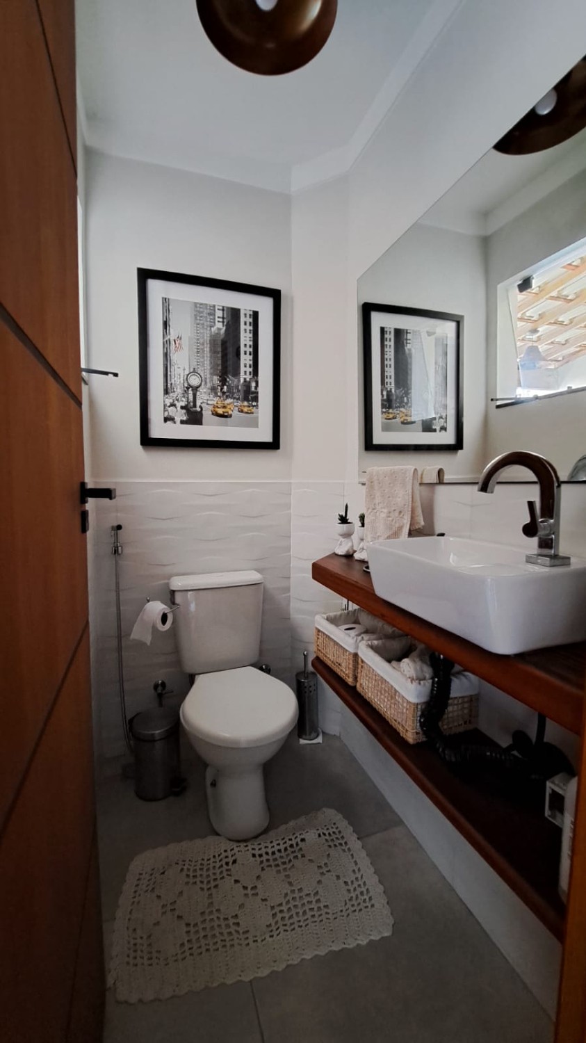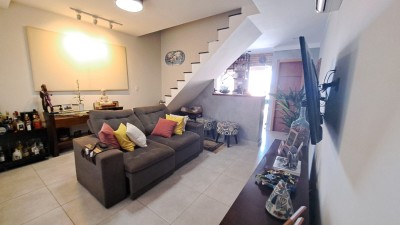 Casa duplex com duas suítes, sala ampla, cozinha com móveis planejados, área de serviço, lavabo e quintal com garagem.