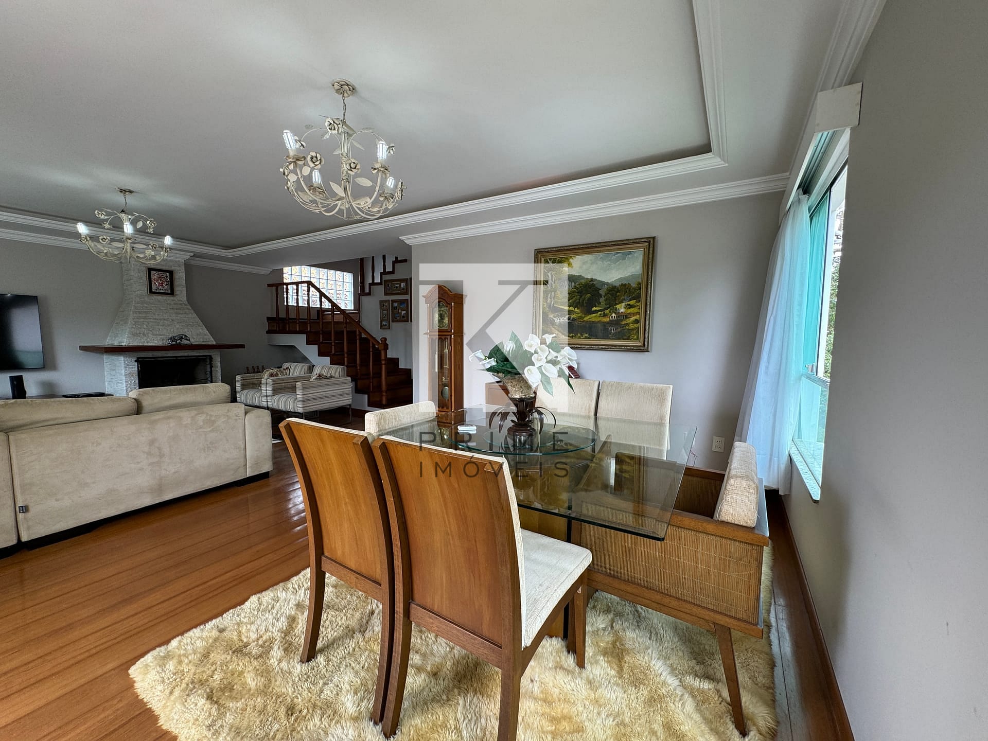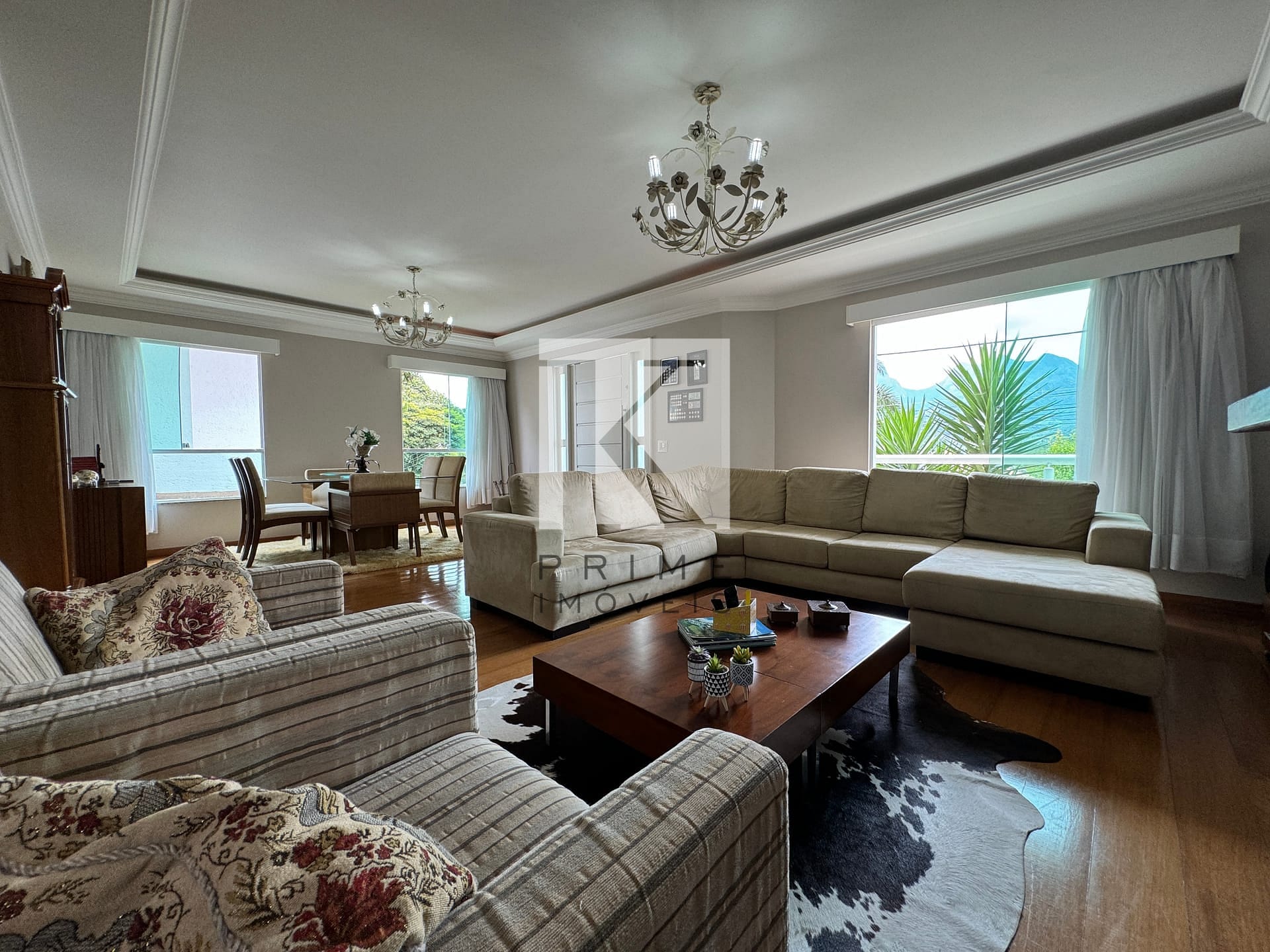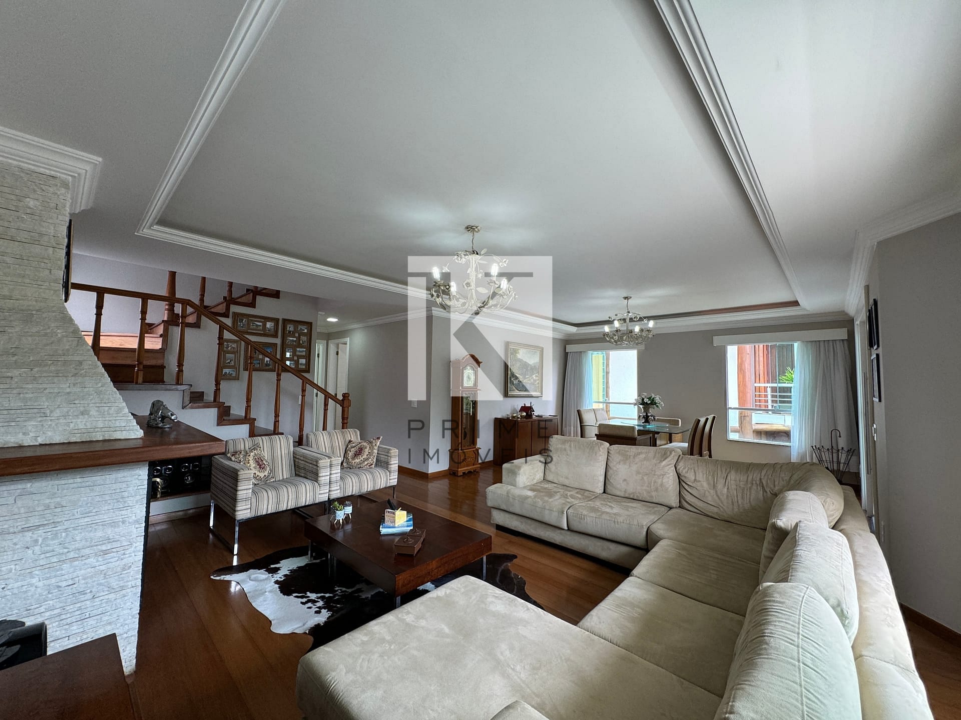 Sala de estar ampla e sofisticada, integrada à sala de jantar.