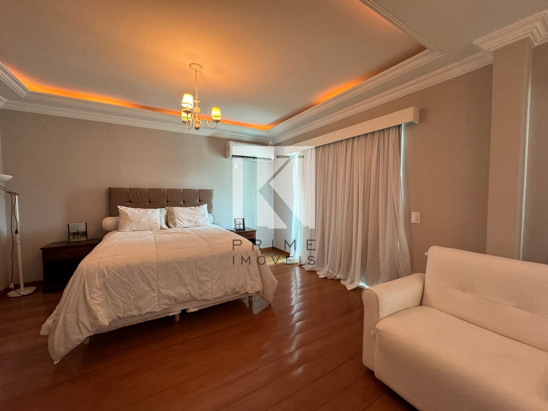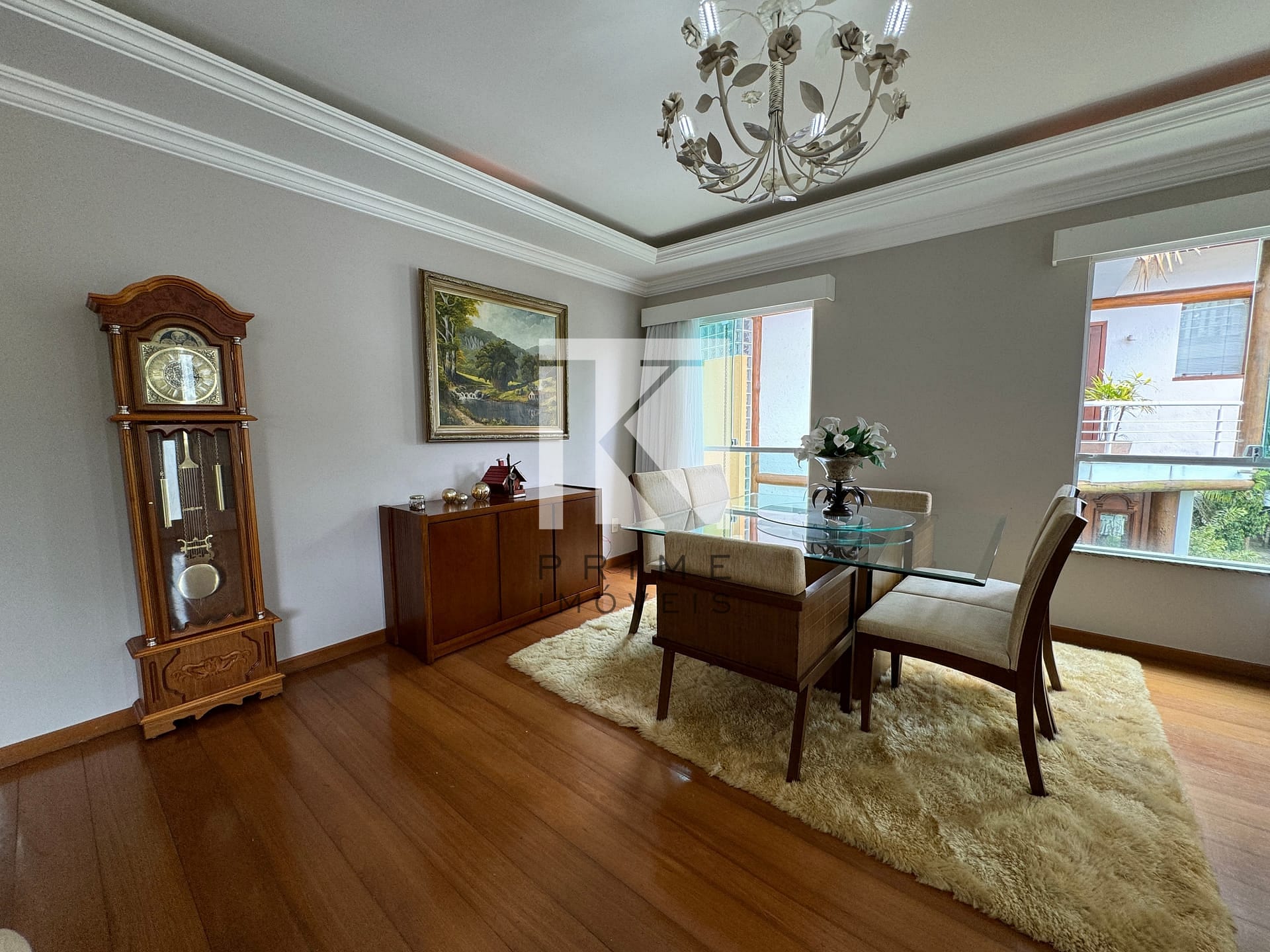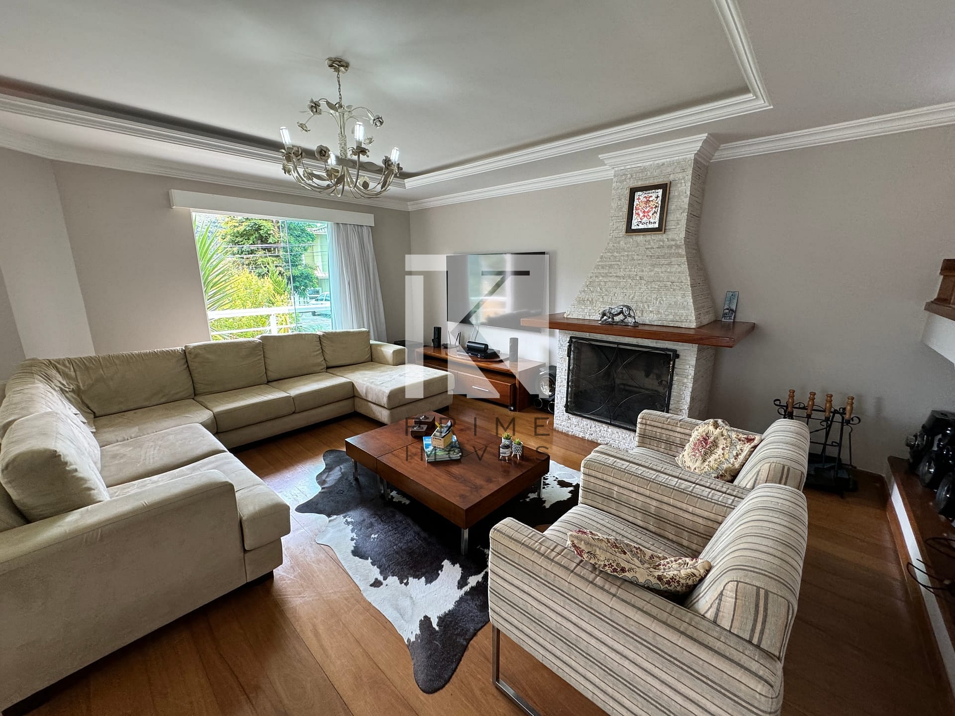 Sala de estar ampla e sofisticada, integrada à sala de jantar.